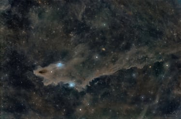 The Jellyfish Nebula, also known as IC 443 or Sh2-248, is a stunning supernova remnant located approximately 5,000 light-years away from Earth in the constellation Gemini. This fascinating cosmic structure is believed to be around 30,000 years old, originating from a massive star that ended its life in a brilliant explosion. The remnants of the supernova are characterized by their intricate filaments and vibrant colors, which result from the interaction between the expelled stellar material and the surrounding gas and dust. Its delicate structure resembles a jellyfish gliding through the cosmic ocean, making it a captivating feature of the night sky.