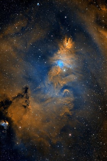 The Christmas Tree Cluster, also known as NGC 2264, is a stunning open star cluster located in the constellation Monoceros. Its name derives from its unique arrangement of stars that resemble a decorated Christmas tree when viewed from Earth. At its heart lies the prominent star 15 Monocerotis, which is a bright and significant member of the cluster. The region around NGC 2264 is rich in cosmic phenomena, including the mesmerizing surrounding nebula, which showcases vibrant hues of blue and yellow. This celestial wonder not only captivates astronomers but also enthusiasts with its enchanting beauty and the mysteries it holds. The Christmas Tree Cluster serves as a fascinating example of star formation and an inviting portal into the vastness of our universe.