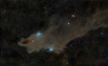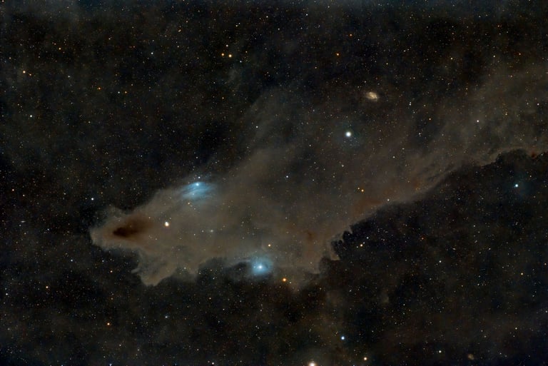 The Shark Nebula, also known as LDN 1235, is a fascinating dark nebula located in the constellation Cepheus. This intriguing nebula gets its nickname from its resemblance to a shark gliding through the vastness of space. LDN 1235 is notable not only for its striking appearance but also for its complex interplay of dust and gas, which plays a crucial role in star formation. Within this region lies the star 16 Cep, a relatively bright star that serves as a beacon amidst the surrounding cosmic darkness. The interplay between the Shark Nebula and 16 Cep creates a captivating backdrop for astronomers and stargazers alike, showcasing the beauty and mystery of the universe. As they observe this celestial landscape, one cannot help but marvel at the intricate processes that govern the birth and evolution of stars, revealing the hidden wonders of our cosmos.