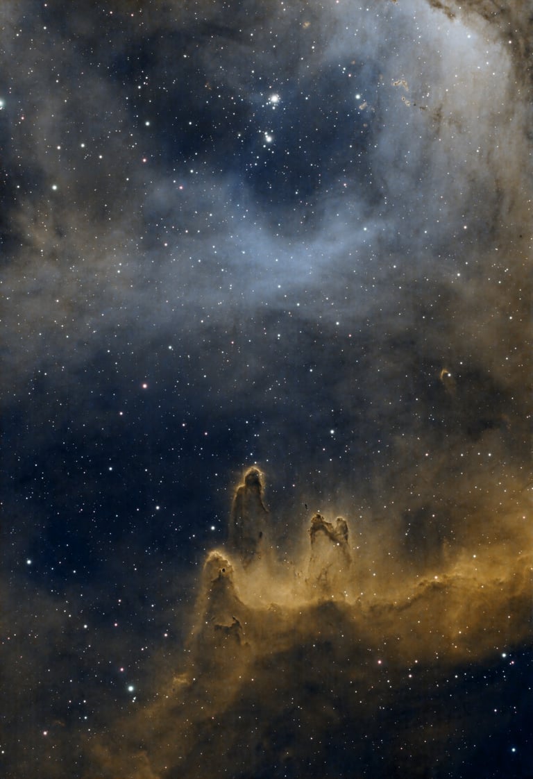 Part in the Soul Nebula, also known as IC 1848, is a stunning emission nebula located in the constellation Cassiopeia. This magnificent region of space is renowned for its intricate patterns of gas and dust, which create a vivid tapestry of colors and shapes across the night sky. The nebula is a hotbed of star formation, with young, luminous stars illuminating the surrounding material and contributing to its ethereal appearance. Photographic images reveal swirling clouds of hydrogen, with bright regions where stars are born, creating a breathtaking scene that captivates astronomers and stargazers alike. Observing IC 1848 offers a glimpse into the dynamic processes of stellar birth and evolution, making it an essential object of study for those fascinated by the cosmos and the intricate dance of celestial bodies within our universe.