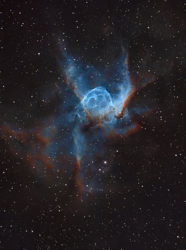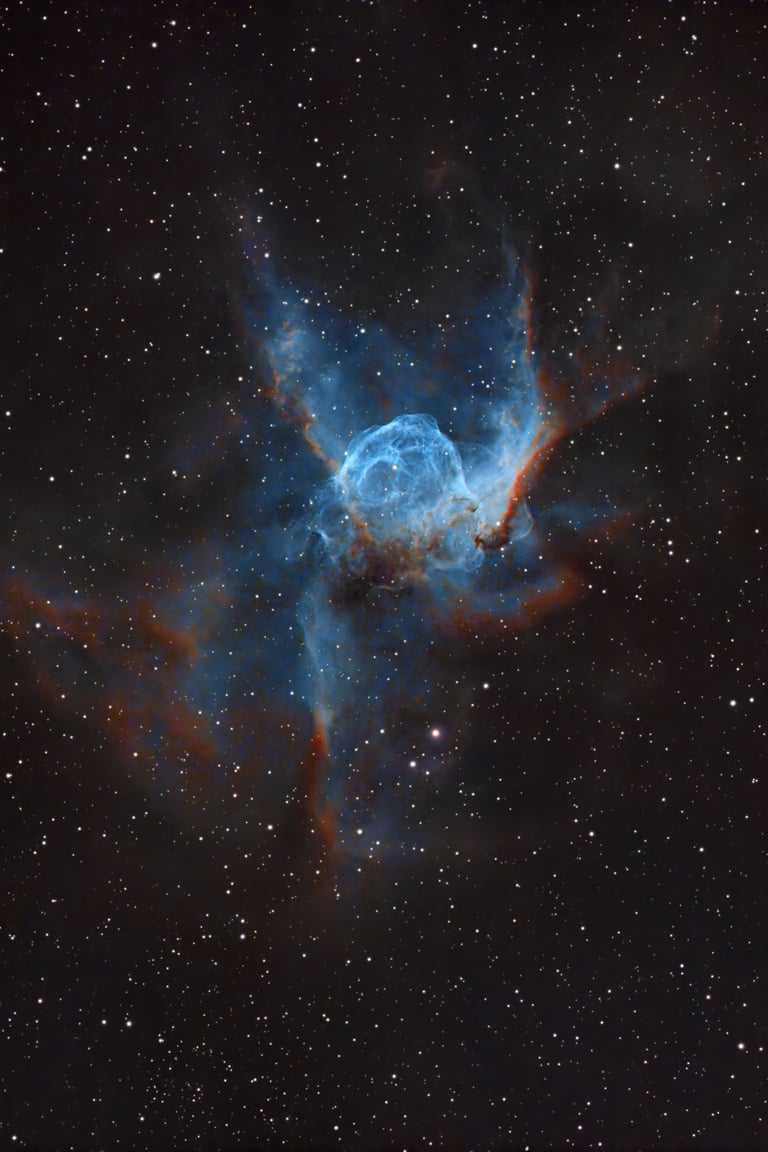 The Thor's Helmet Nebula, officially designated as NGC 2359, is a striking planetary nebula located approximately 12,000 light-years away in the constellation Canis Major. This remarkable object is named for its resemblance to the helmet worn by the Norse god Thor, showcasing a beautifully intricate structure dominated by an expanding shell of gas and dust. The nebula's vibrant colors, primarily shades of blue and red, are a result of the intense radiation from its central star, which is nearing the end of its life cycle. As stellar winds from this hot young star interact with the surrounding material, they sculpt intricate filaments and bubbles that create a visually stunning cosmic tapestry. Thor's Helmet Nebula not only captivates astronomers with its beauty but also provides valuable insights into the processes of stellar evolution and the dynamics of planetary nebulae. Its unique shape and vivid hues make it a favorite target for both amateur and professional astrophotographers alike.